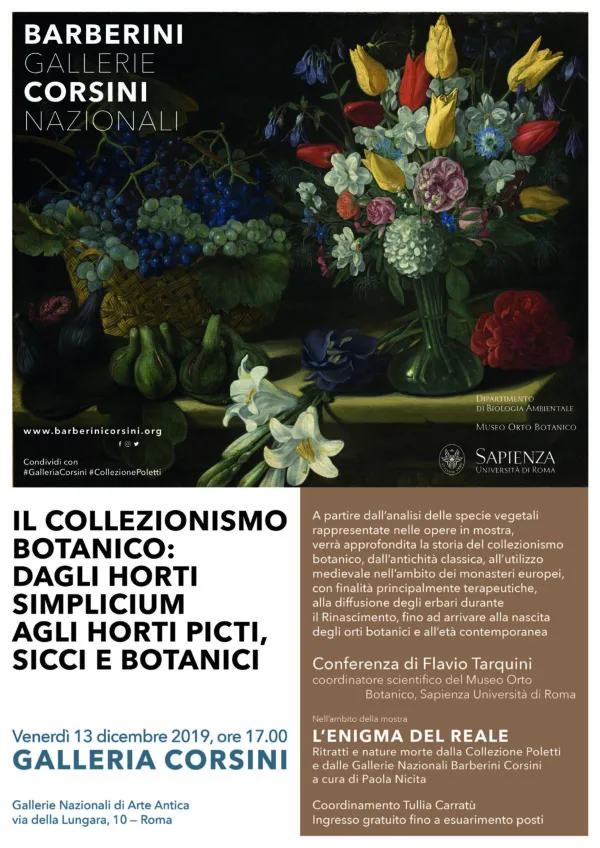 Venerdì 13 dicembre 2019, alle ore 17.00, alla Galleria Corsini, si terrà la conferenza Il Collezionismo Botanico: dagli Horti Simplicium agli Horti picti, sicci e botanici a cura di Flavio Tarquini, coordinatore scientifico del Museo Orto Botanico Sapienza Università di Roma, nell’ambito della mostra in corso fino al 2 febbraio 2020 L’enigma del reale. Ritratti e nature morte dalla Collezione Poletti e dalle Gallerie Nazionali Barberini Corsini, a cura di Paola Nicita.