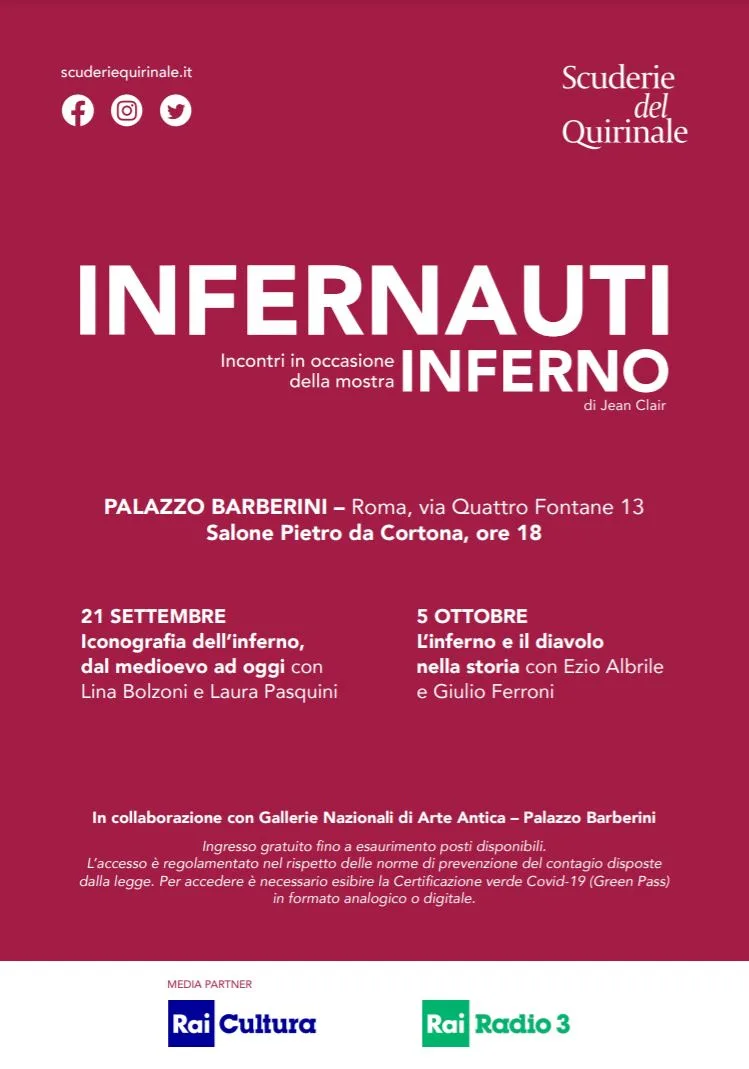 In occasione della mostra Inferno in programma alle Scuderie del Quirinale, dal 15 ottobre 2021 al 9 gennaio 2022, le Gallerie Nazionali di Arte Antica ospitano a Palazzo Barberini, nel Salone Pietro da Cortona, due degli incontri previsti nel programma di eventi collaterali: